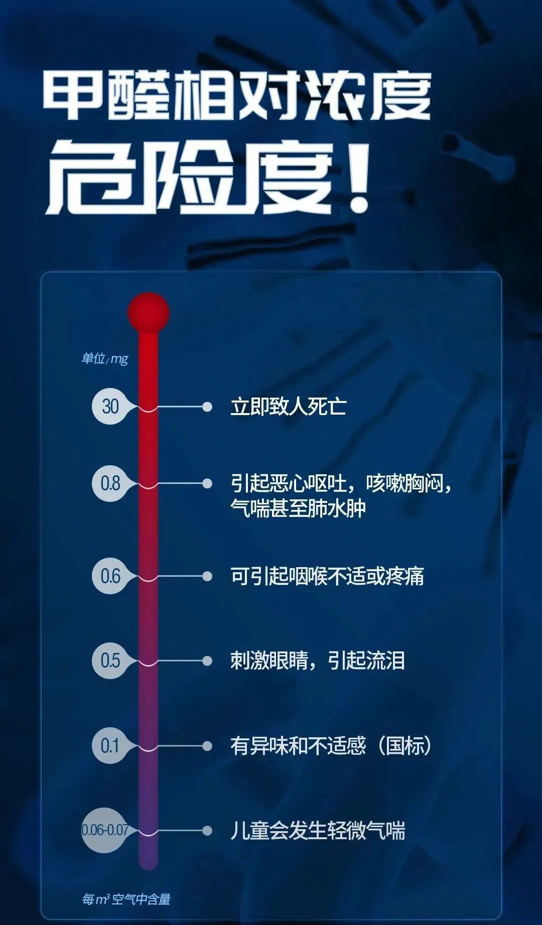 《室內空氣質量標準》對甲醛的限量要求:關閉門窗12小時后,測量室內甲醛含量1小時,最高濃度不得超過0.1mg/m3。但對抵抗力差、體質敏感的人,即使接近標準限量,也會有危險。