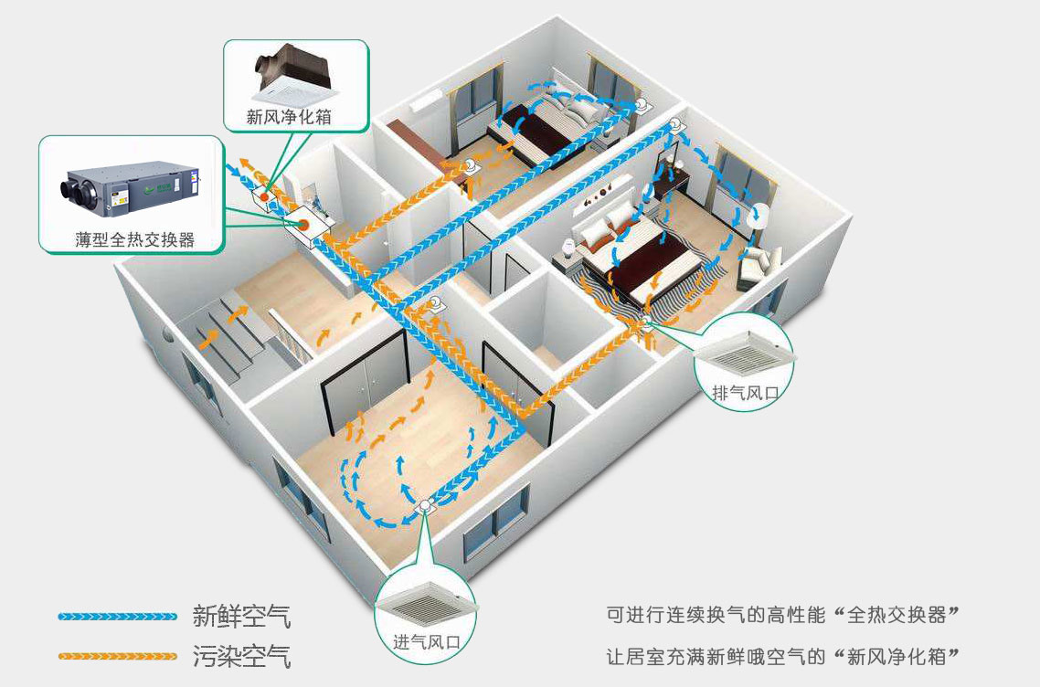 | 調(diào)節(jié)室溫 | 夏天的夜晚,用換氣扇驅(qū)走室內(nèi)的熱氣,把外面涼爽的空氣替換進(jìn)來(lái),冬天進(jìn)行全熱交換減 少室內(nèi)溫度流失,提高冬天的取暖效果。 |