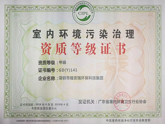 格安瑞環(huán)保科技集團是一家專業(yè)從事室內(nèi)環(huán)境衛(wèi)生污染治理產(chǎn)品研發(fā)、生產(chǎn)、銷售及空氣凈化檢測的高新技術企業(yè),公司擁有行業(yè)門檻最高的國家室內(nèi)環(huán)境凈化治理甲級資質(zhì)及廣東省甲級資質(zhì)(截至目前,格安瑞是華南地區(qū)唯一一家擁有 “雙甲”資質(zhì)的室內(nèi)空氣凈化企業(yè))。迄今為止,格安瑞環(huán)保已獲得空氣凈化領域相關專利十二余項,在行業(yè)內(nèi)率先通過ISO9001質(zhì)量管理體系、ISO14001環(huán)境管理體系雙重認證。